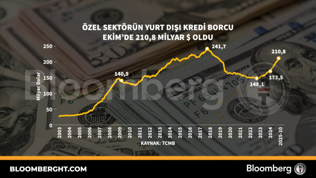 Bloomberg HTGrafikÖzel sektörün yurt dışı kredi borcu Ekim'de 210,8 milyar dolar oldu