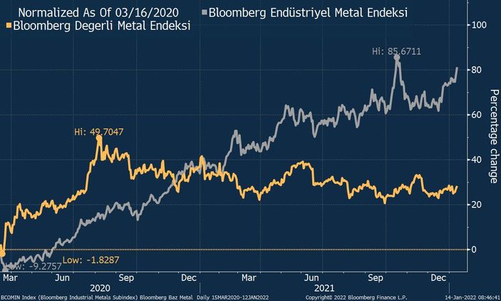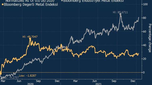 Bloomberg Endüstriyel Metal Endeksi, 2020’nin Mart ayından bu yana yüzde 81 yükseliş kaydederken Bloomberg Değerli Metal Endeksi yüzde 28 yükseliş kaydetti. Aynı dönemde bakır fiyatları yüzde 110 artarken altın fiyatları yüzde 25 civarında bir artış yaşadı.