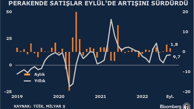 TÜİK verilerine göre, sabit fiyatlarla perakende satış hacmi 2022 yılı Eylül ayında bir önceki yılın aynı ayına göre yüzde 9,7 arttı. Satış hacmi aylık yüzde 1,8 artış gösterdi. Cari fiyatlarla perakende ciro 2022 yılı Eylül ayında bir önceki yılın aynı ayına göre yüzde 130,8 arttı.