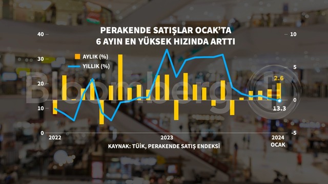 Perakende ticaret satış hacmi Ocak ayında aylık olarak yüzde 2,6 arttı. Böylelikle Temmuz 2023'ten bu yana en yüksek aylık artış kaydedildi.