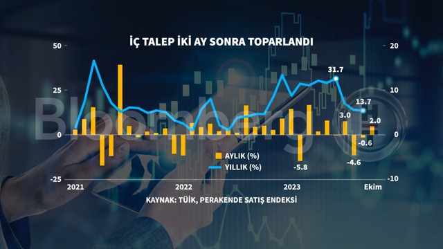• TÜİK verilerine göre yıllık bazda perakende satışlar Ekim'de sabit fiyatlarla yüzde 13,7 arttı. Eylül'de yüzde 0,7 gerileyen satış hacmi Ekim'de yüzde 2 arttı.