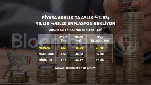 Bloomberg HT'nin Aralık ayına ilişkin düzenlediği enflasyon anketi sonuçlandı. Ankete katılan 26 kurumun medyan beklentisi enflasyonun aylık yüzde 1,63 seviyesinde gerçekleşeceği yönünde oldu.