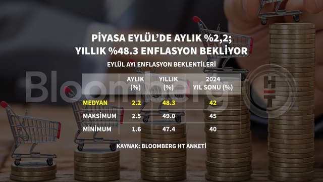 Bloomberg HT'nin anketine katılan piyasa katılımcıları Eylül'de yıllık enflasyonu yüzde 48,3 seviyesinde tahmin etti. Aynı dönem için aylık enflasyon tahmini de yüzde 2,2 oldu.