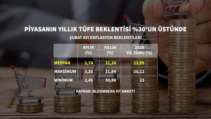 Bloomberg HT’nin anketine göre Şubat'ta enflasyonun aylık bazda yüzde 2,74; yıllık bazda yüzde 31,24 artması bekleniyor. 2026 yıl sonu enflasyon beklentisi ise yüzde 23,95 oldu.