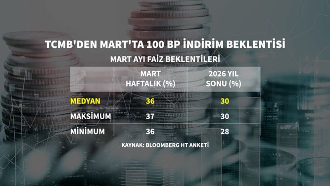 Mart ayı faiz kararına ilişkin ankete göre ise politika faizinin 100 baz puan indirimle yüzde 36 seviyesine düşürülmesi bekleniyor.