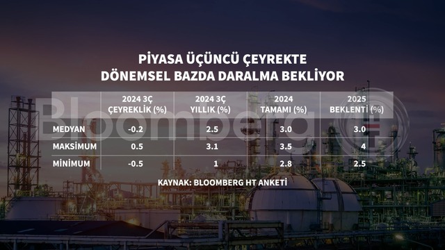 Bloomberg HT'nin büyüme anketine göre, Türkiye'nin üçüncü çeyrekte bir önceki çeyreğe göre yüzde 0,2 daralması öngörülüyor. Ankette yıllık bazda ise aynı dönem için yüzde 2,5 büyüme bekleniyor.