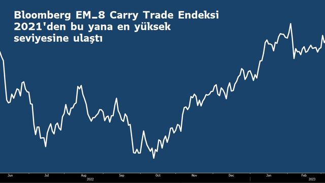 Bloomberg’in dolar cinsinden borçlanarak Türk lirasının da dahil olduğu 8 gelişmekte olan ülke para birime yatırım yapmanın kümülatif getirisini hesaplayan EM-8 Carry Trade Endeksi yıl başından bu yana yaklaşık yüzde 5 yükseldi, üç yıllık düşüş trendini kırdı ve 2021’den bu yana en yüksek seviyesine ulaştı.