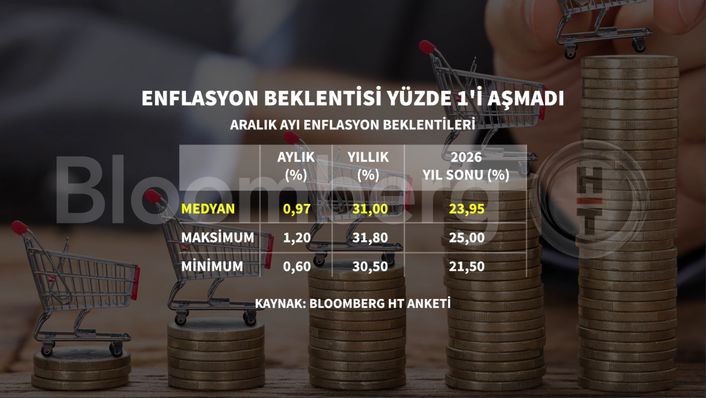 Bloomberg HT anketine katılan ekonomistlerin medyan beklentisine göre, Aralık ayında tüketici fiyat endeksinin (TÜFE) aylık bazda yüzde 0,97 oranında artması bekleniyor. Bu tahminler doğrultusunda, yıllık enflasyonun yüzde 31 seviyesinde gerçekleşeceği öngörülüyor.