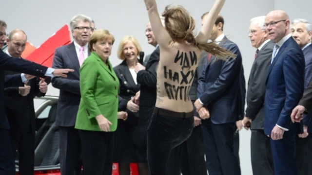 Almanya'nın Hannover kentinde açılan Sanayi Fuarı'nda stantları ziyaret eden Putin ve Merkel, bir anda çığlık atıp üzerindeki elbiseleri çıkaran FEMEN üyelerini karşılarında görünce şaşırdı ancak daha sonra gülmeye başladı.