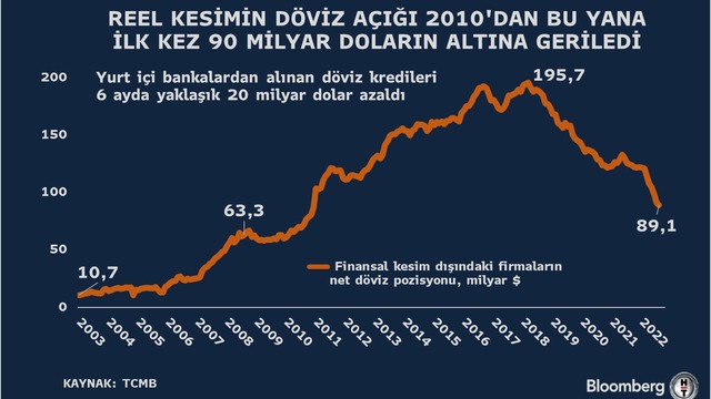 Türkiye Cumhuriyet Merkez Bankası verilerine göre finansal kesim dışındaki firmaların net döviz pozisyon açığı Ağustos'ta aylık 2,02 milyar dolar düşüşle 89,1 milyar dolar oldu. Reel kesim döviz açığı 2010 yılından beri ilk kez 90 milyar doların altına indi.