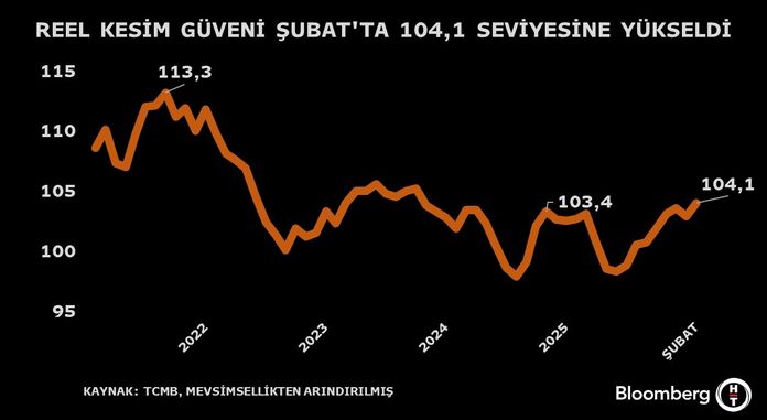 TCMB verilerine göre, mevsimsellikten arındırılmamış reel kesim güven endeksi bir önceki aya göre 2,5 puan artarak 104,1 seviyesinde gerçekleşti.