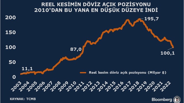 Merkez Bankası verilerine göre, finansal kesim dışı firma net döviz pozisyon açığı 100 milyar 78 milyon dolar olarak gerçekleşti. Net döviz açığı Mayıs 2022 dönemine göre 5 milyar 848 milyon dolar azaldı. Reel kesimin döviz açığı son 12 yılın en düşük seviyesine inerken düşüş şirketlerin yurt dışı bankalardan sağladığı uzun vadeli kredilerin azalmasından kaynaklandı.