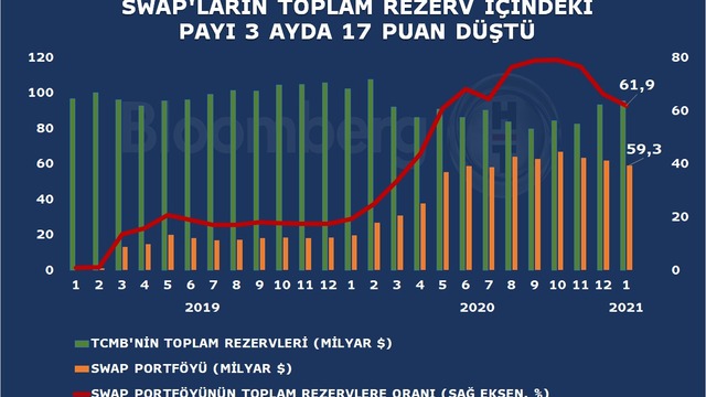 TCMB'nin yayımladığı Uluslararası Rezervler ve Döviz Likiditesi Gelişmeleri'ne göre Ocak ayı itibariyle swapların rezervler içindeki payı yüzde 62 seviyesine geldi. Bu oran yüzde 80'lere dayanmıştı.