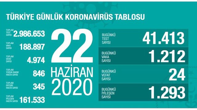 Türkiye'de son 24 saatte 1212 kişiye Kovid-19 tanısı konuldu, 24 kişi hayatını kaybetti, toplam vaka sayısı 188 bin 897, can kaybı 4 bin 974 oldu