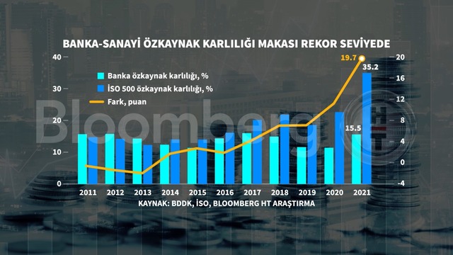 Verilere göre 2021 yılında İSO 500'ün özkaynak kârlılığı yüzde 35,2 olarak kaydedildi. BDDK verilerine bakıldığında ise bankacılık sektörünün aynı dönemde özkaynak kârlılığı yüzde 15,5 oldu. Böylelikle iki sektör arasındaki kârlılık makası 19,7 ile 10 yılın en yüksek seviyesine çıktı.