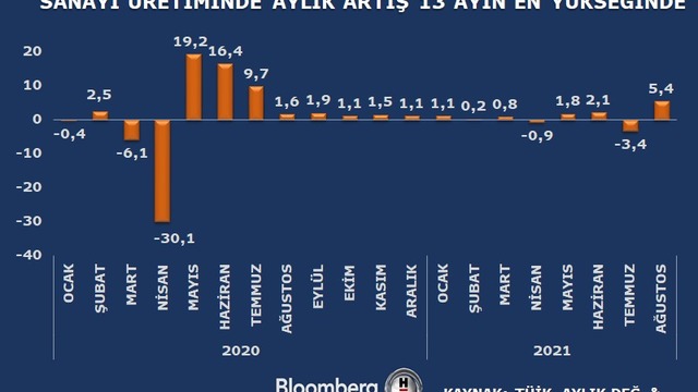 Türkiye İstatistik Kurumu Ağustos ayına ilişkin sanayi üretim verilerini yayımladı. Buna göre sanayi üretimi aylık yüzde 5,4; yıllık ise yüzde 13,8 artışla beklentileri aştı. Dayanıklı tüketim malı üretimi aylık yüzde 0,1 büyürken yıllık yüzde 8,3 artış kaydetti. Sermaye malı üretimi aylık yüzde 15,6, yıllık yüzde 20,5 arttı.