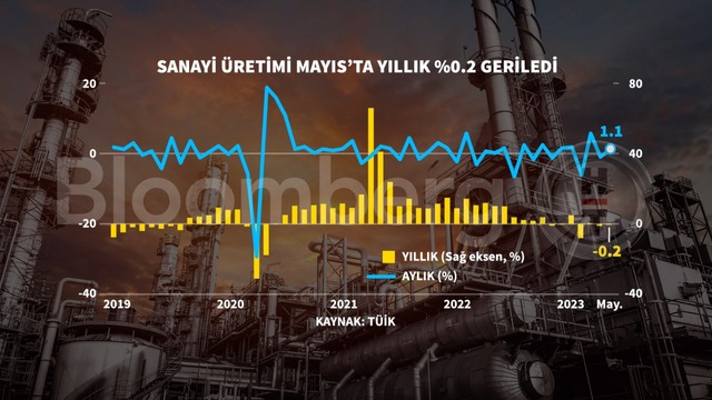 Türkiye İstatistik Kurumu (TÜİK) verilerine göre sanayi üretimi Mayıs ayında yıllık olarak yüzde 0,2 düştü. Bloomberg'in anketine göre Mayıs ayında sanayi üretiminde yıllık yüzde 0,8'lik artış bekleniyordu.