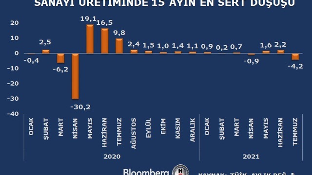 Sanayi üretimi, Haziran'da 10 ayın en hızlı yükselişini kaydettikten sonra Temmuz'da bir önceki aya göre yüzde 4,2 azalarak Nisan 2020'den bu yana en hızlı aylık düşüşü kaydetti.