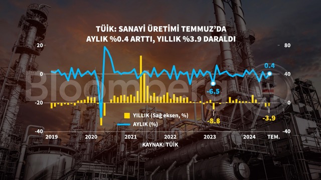 Türkiye İstatistik Kurumu (TÜİK) verilerine göre, Temmuz'da sanayi üretimi yıllık bazda yüzde 3,9 geriledi. Haziran ayında daha önce yüzde 4,7 olarak açıklanan daralma da yüzde 5'e revize edildi.
