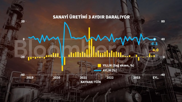 Türkiye İstatistik Kurumu verilerine göre sanayi üretimi eylül ayında aylık yüzde 0,1 gerileyerek üçüncü ay üst üste aylık daralma kaydetti.