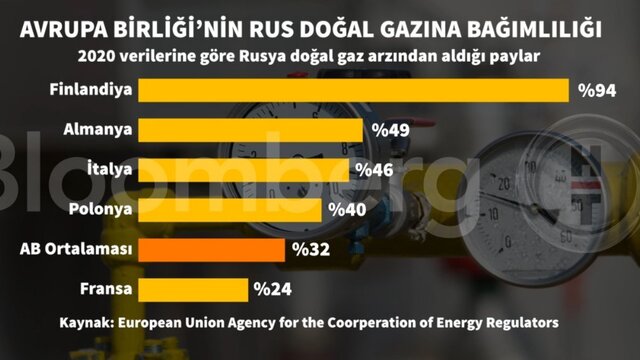 AB, ham petrol, doğalgaz ve katı yakıt ithalatında en çok Rusya’ya, sonrasında ise Norveç'e bağımlı. Rusya’nın AB’ye sağladığı doğalgazın toplam oranı ise yüzde 35 civarında. Diğer taraftan, Rus gazına yaklaşık yüzde 50 oranında bağımlı olan Almanya, Kuzey-Akım 2 projesini iptal etmeden önce, toplam maliyeti yaklaşık 11 milyar dolar olarak öngörülen projeden yılda 55 milyar metreküplük doğalgaz almayı planlıyordu.