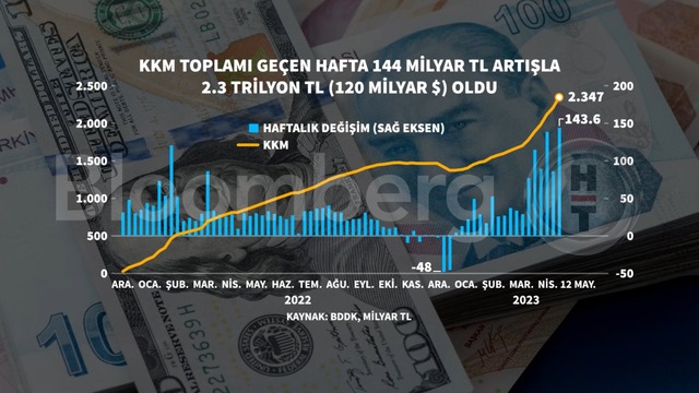 Bankacılık Düzenleme ve Denetleme Kurumu (BDDK) verilerine göre kur korumalı mevduatlara 12 Mayıs haftasında 144 milyar TL'lik giriş kaydedildi. Toplam mevduat 2,35 trilyon liraya yükseldi. Dolar cinsinden bakıldığında ise 120 milyar dolarlık büyüklüğe ulaşıldı.