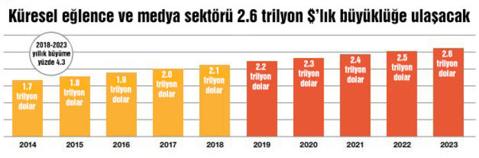 Bunun yanında rapora göre küresel eğlence ve medya sektörü önümüzdeki 4 yılda büyümesini devam ettirecek. Geçtiğimiz yıl 2.1 triyon dolara ulaşan sektörün büyüklüğü bu yıl 2.2, gelecek yıl 2.3 trilyon doları bulacak. Sektörün 2023 yılına kadar yıllık ortalama büyümesi yüzde 4.3 olacak. Raporda bir dikkat çeken detay ise dijital gelirlerin sektör içindeki payının her yıl artması oldu. PwC verilerine göre ilk kez 2017 yılında dijital gelirlerin küresel eğlence ve medya sektörü toplamındaki payı yüzde 50'yi geçti ve o tarihten beri payını artırmayı sürdürüyor. Bu yıl dijital gelirlerin payının yüzde 55.4'e, 2023 yılında ise yüzde 61.6'ya yükselmesi bekleniyor.