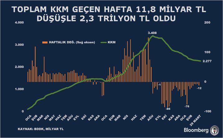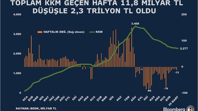 Bankacılık Düzenleme ve Denetleme Kurumu (BDDK) verilerine göre 29 Mart haftasında 11,8 milyar TL düşüşle 2,27 trilyon TL oldu.