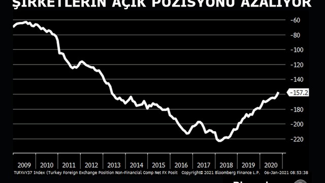 • Türkiye Cumhuriyet Merkez Bankası verilerine göre finansal kesim dışındaki şirketlerin döviz pozisyonu açığı Ekim 2020 itibariyle 157,2 milyar dolara geriledi. Böylelikle Nisan 2013'ten bu yana döviz pozisyonu açığında en düşük seviye kaydedildi