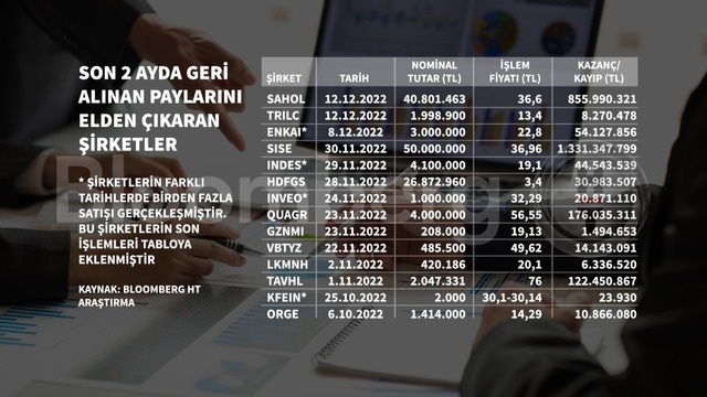 • Bloomberg HT Araştırma'nın derlediği verilere göre son iki ayda aralarında Sabancı Holding, Enka ve Şişecam'ın olduğu 14 şirket geri aldığı paylardan satış gerçekleştirdi. Bu şirketler toplamda alınan paylarını elden çıkarılmasıyla 2,68 milyar TL kazanç elde etti.