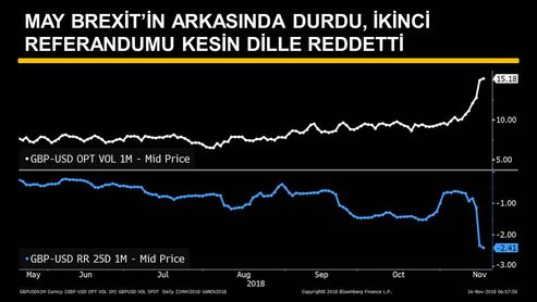 Sterlinin 1 aylık zımni volatilitesi, İngiltere'de dört bakanın Başbakan Theresa May'in Avrupa Birliği (AB) ile bu hafta vardığı Brexit anlaşmasını protesto amaçlı istifasının ardından Temmuz 2016'dan beri en yüksek seviyesine geldi.