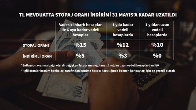 Eylül 2020'de mevduatta stopaj oranlarıyla ilgili 3 aylığına getirilen ve Aralık'ta 3 aylık uzatma yapılan mevduattaki stopaj kesintileri uygulaması 31 Mayıs tarihine uzatıldı
