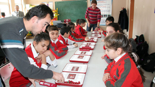 Bartın Gençlik Merkezi Çalışanları, Türk topluluklarında 4 bin yıllık geçmişe sahip strateji ve zeka oyunu "mangalayı" köy okullarında tanıtıyor.