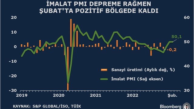 İmalat satınalma yöneticileri endeksi (PMI) Türkiye'yi sarsan depremlerin yaşandığı Şubat ayında 50,1 değerini aldı.