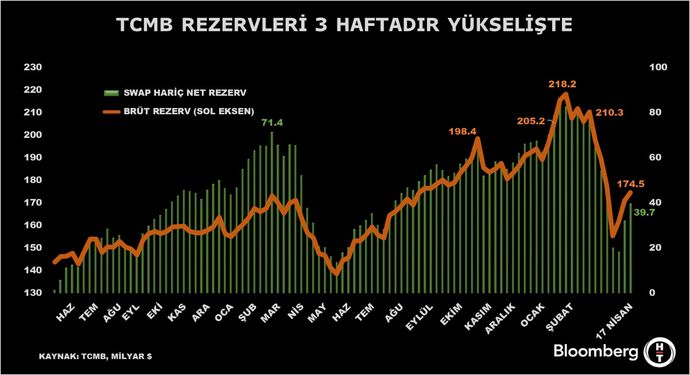 Swap hariç net rezerv 17 Nisan haftasında da yükseldi. Bu rezervlerde 9,3 milyar dolarlık toparlama ile 39,7 milyar düzeyi kaydedildi. Son iki haftadaki toparlanma 21,4 milyar dolar oldu.