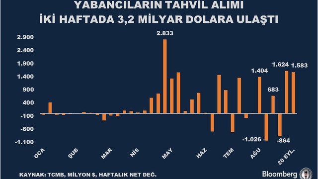 Türkiye Cumhuriyet Merkez Bankası'nın (TCMB) verilerine göre, yabancı yatırımcılar 20 Eylül haftasında tahvillerde net 1,6 milyar dolarlık alım gerçekleştirdi. Bir önceki haftada da 1,7 milyar dolarlık alım kaydedilmişti. Böylelikle son iki haftada da tahvillerde alımlar 3 milyar doları aştı.