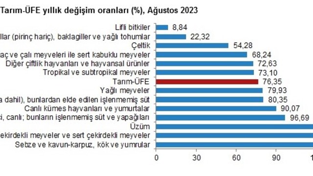 Tarım-ÜFE Ağustos'ta aylık bazda yüzde 3,83 yükselirken, yıllık bazda yüzde 76,35 arttı.