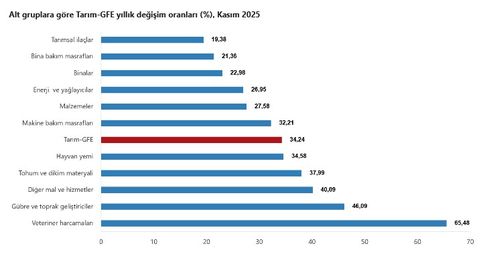 TÜİK tarafından açıklanan Tarımsal Girdi Fiyat Endeksi (Tarım-GFE), Kasım'da aylık bazda yüzde 1,84 artarken, yıllık bazda yüzde 34,24 yükseldi.