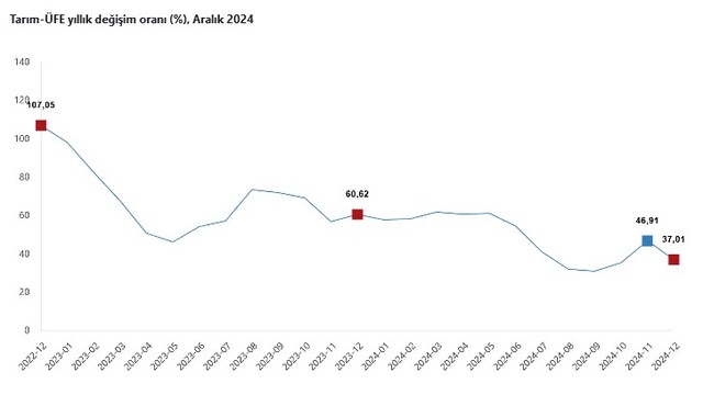 Tarım-ÜFE'de, 2024 yılı Aralık ayında bir önceki aya göre yüzde 0,39 azalış, bir önceki yılın Aralık ayına göre yüzde 37,01 artış, bir önceki yılın aynı ayına göre yüzde 37,01 artış ve on iki aylık ortalamalara göre yüzde 46,90 artış gerçekleşti.