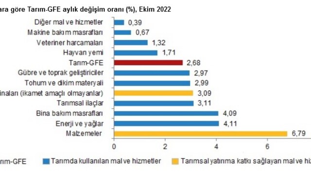 Yıllık artışın düşük olduğu alt gruplar sırasıyla, %38,42 ile veteriner harcamaları ve %63,76 ile diğer mal ve hizmetler oldu. Buna karşılık, yıllık artışın yüksek olduğu alt gruplar ise sırasıyla, %196,89 ile enerji ve yağlar ve %192,52 ile gübre ve toprak geliştiriciler oldu.