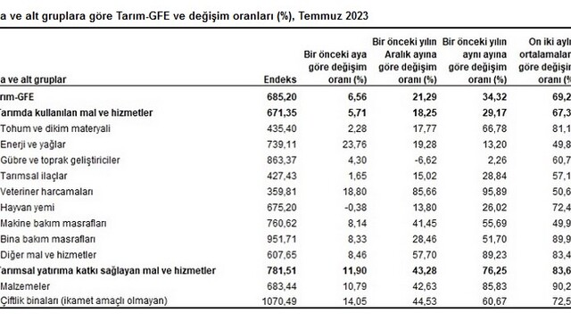 Tarımsal girdi fiyat endeksi (Tarım-GFE) Temmuz'da aylık bazda yüzde 6,54 artarken, yıllık bazda yüzde 34,32 yükseldi.