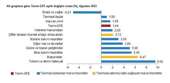 Aylık artışın yüksek olduğu alt gruplar sırasıyla, %9,62 ile tohum ve dikim materyali ve %6,47 ile malzemeler oldu. Bir önceki aya göre azalış gösteren tek alt grup ise %5,01 ile enerji ve yağlar oldu. Aylık artışın düşük olduğu alt gruplar ise sırasıyla, %1,00 ile tarımsal ilaçlar ve %1,59 ile hayvan yemi oldu.
