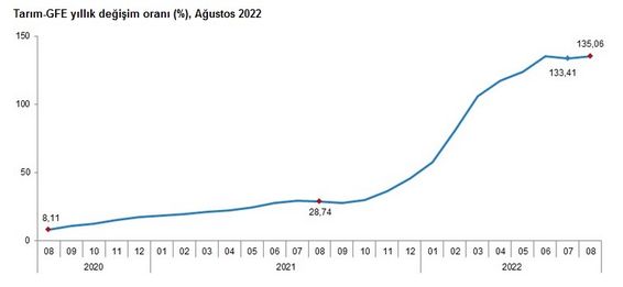 Tarımsal Girdi Fiyat Endeksi (Tarım-GFE) Ağustos'ta aylık bazda yüzde 1,64 artarken, yıllık bazda yüzde 135,06 yükseldi.