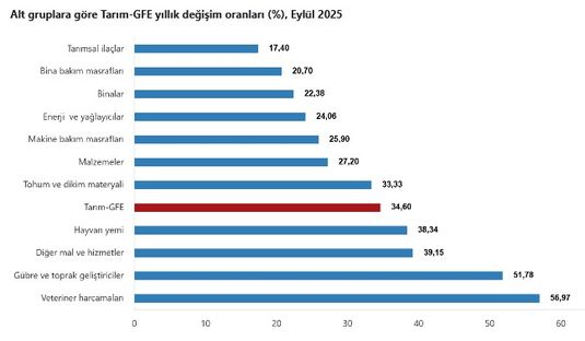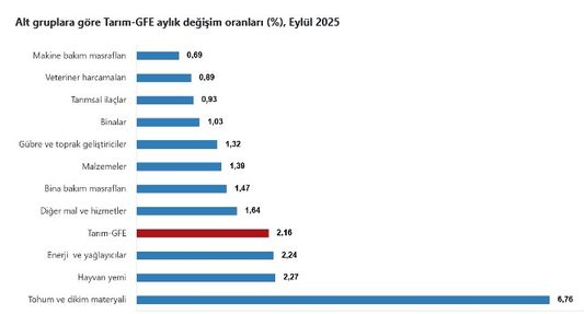 TÜİK'in Eylül ayına ilişkin yayımladığı Tarımsal Girdi Fiyat Endeksine (Tarım-GFE) göre, aylık artış yüzde 2,16 olurken, yıllık bazda yükseliş yüzde 34,60 olarak gerçekleşti.
