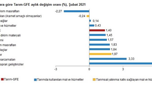 Tarımsal girdi fiyat endeksi (Tarım-GFE) Şubat ayında bir önceki aya göre yüzde 1,40 yükselriken, bir önceki yılın aynı ayına göre yüzde 19,60 arttı.