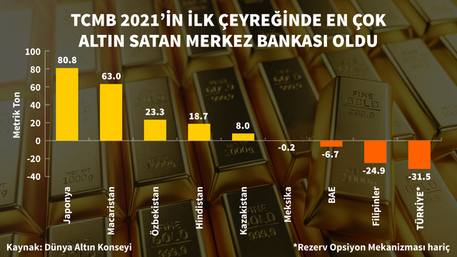 Raporda TCMB’nin altın rezervlerinin 2021'in ilk çeyreğinde 31,5 ton azalarak 512,5 tona düştüğü belirtilirken, art arda üç çeyrektir net satıcı konumunda bulunduğu da vurgulanıyor. Filipinler ise 24,9 ton altın satışıyla ikinci sırada gelirken, üçüncü sırada 6,7 ton satışla Birleşik Arap Emirlikleri geliyor.