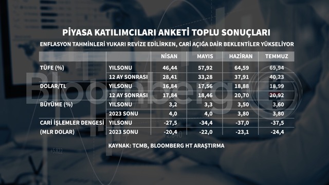 Merkez Bankası'nın Temmuz ayı Piyasa Katılımcıları anketinde yıl sonu TÜFE beklentisi yüzde 64,59'dan yüzde 69,94'e, yıl sonu dolar/TL tahmini 18,89'dan 18,99'a yükseldi