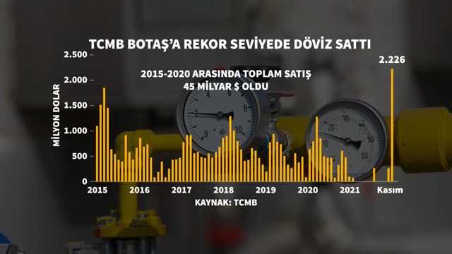 TCMB’nin BOTAŞ’a 2015-2020 yılı arasında toplam döviz satışı ise 45 milyar doları bulmuştu. TCMB'nin aylık döviz alım-satım tutarları verisine göre, 2021’in Ocak ayında 6 yılın ardından ilk kez BOTAŞ'a döviz satışı gerçekleşmemişti.