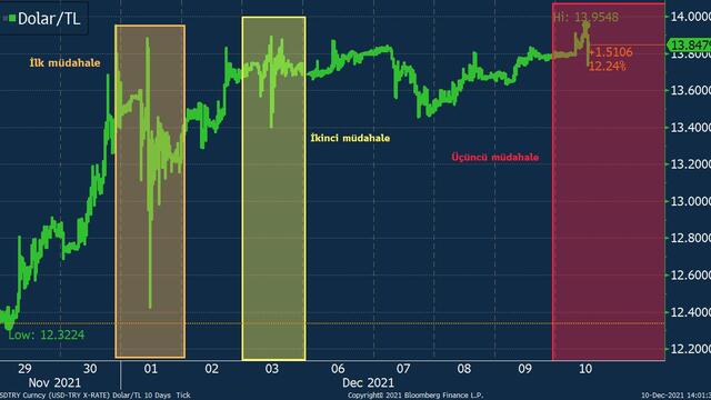 TCMB’nin müdahalesi öncesinde 30 Kasım’da 13,95’e kadar tırmanan dolar kuru, müdahaleler sonrasında en yüksek 10 Aralık’ta 13,9542 seviyesini görürken 3 Aralık’ta en düşük 13,4026 seviyesini görmüştü.