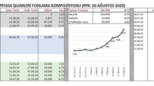 TCMB'nin en son gerçekleştirdiği haftalık repo ihalesinin vadesi 13 Ağustos 2020 (bugün) idi. TCMB son dört günde yaptığı gibi haftalık repo ihalesi açmadı ve bu kanaldan yapmış olduğu fonlamayı sıfırladı.